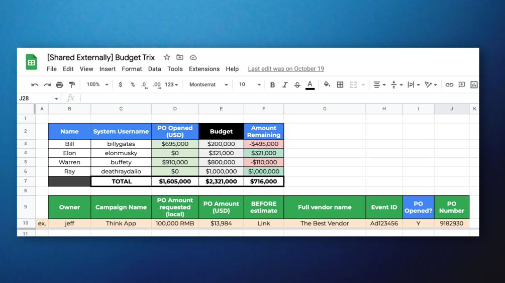 The budget management spreadsheet I use at work as a Product Marketing Manager