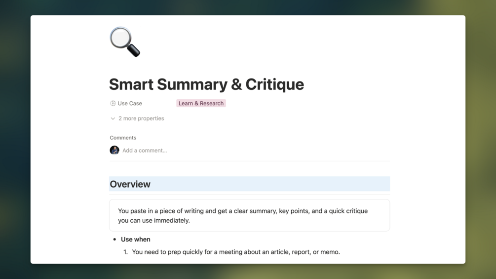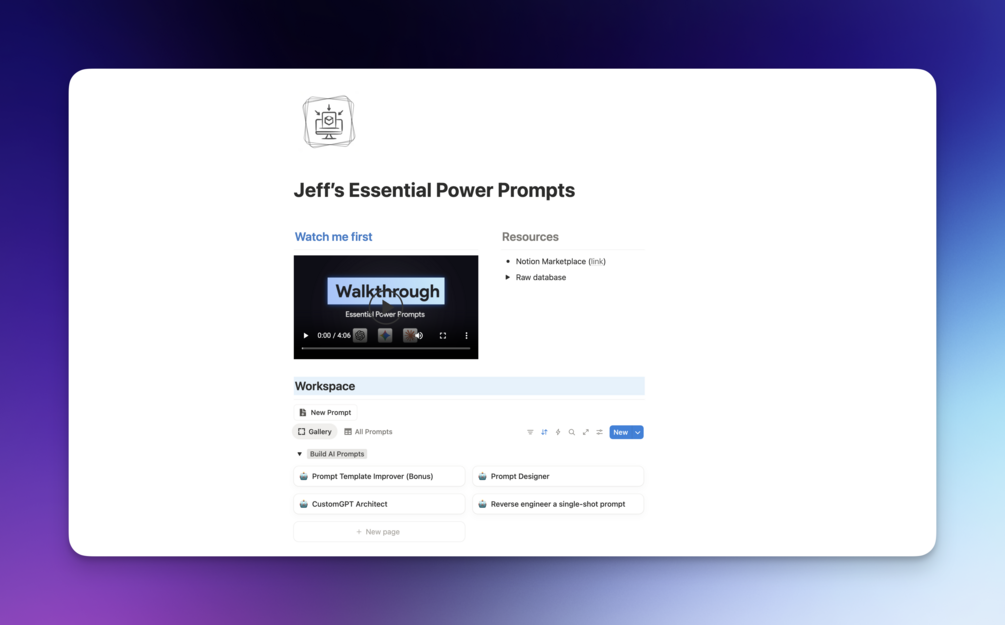 15 battle-tested AI prompts in a Notion template, with video walkthroughs showing real usage, decision frameworks for when to use each one, and a structure to add your own prompts over time.