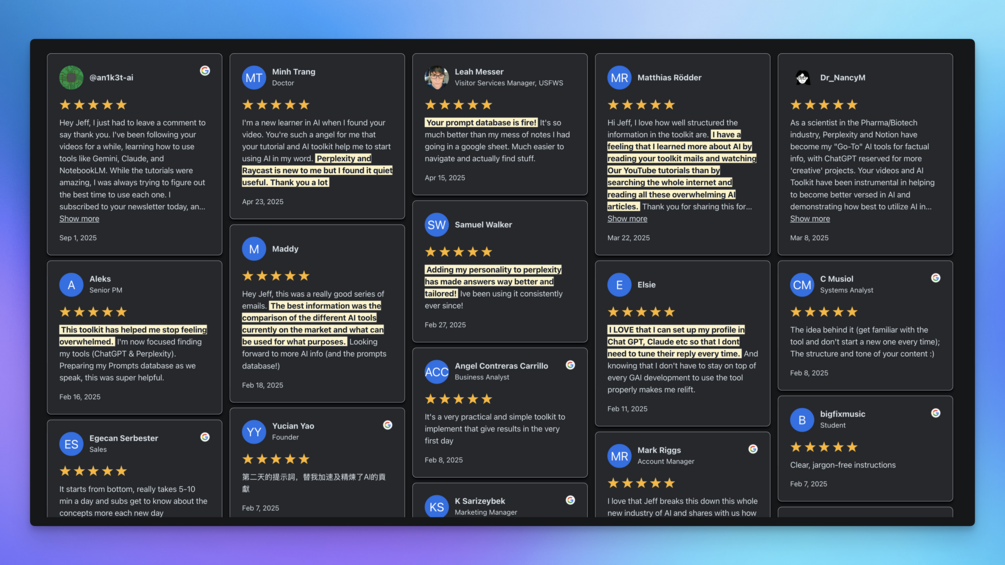 - Years of real-world testing: I built these while working at Google and running a YouTube channel with 1.5M subscribers. The prompts that didn't hold up got cut. What's left consistently delivers.